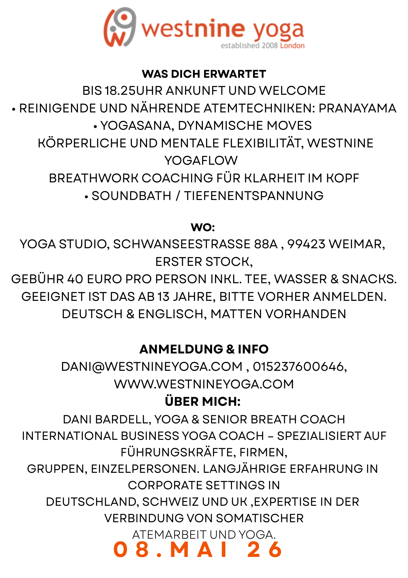 Mehr infos direkt bei mir: dani@westnineyoga.com